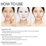2. Una vez que Reedle Shot 300 se haya absorbido completamente, coloca la mascarilla de hoja sobre el rostro. Retírala después de 10-20 minutos, dando ligeros toques para que la esencia restante se absorba en la piel.