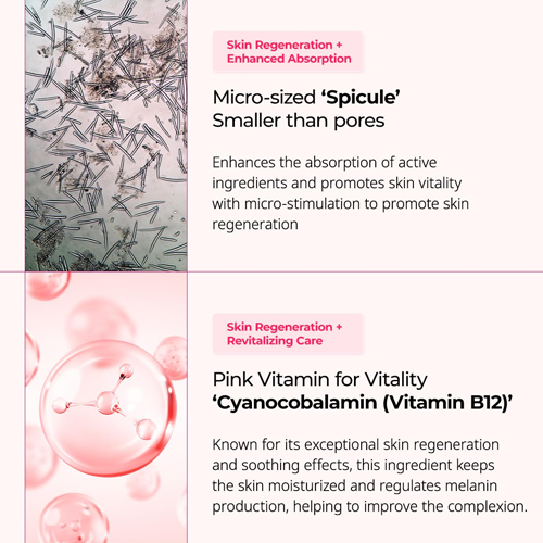 • Las espículas de tamaño micro facilitan la absorción de los ingredientes efectivos en la piel, logrando así la regeneración cutánea.