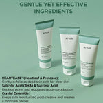 • Incluye HEARTEASE (extracto de Houttuynia cordata y proteasa) para ayudar a remover residuos y células muertas relacionadas con enzimas de digestión de proteínas, sin irritar la piel.