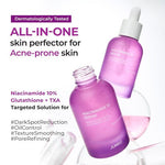 Enriquecido con 10% de Niacinamida, Glutatión y Ácido Tranexámico (TXA) para reducir visiblemente las manchas oscuras y promover una complexión más luminosa y uniforme.