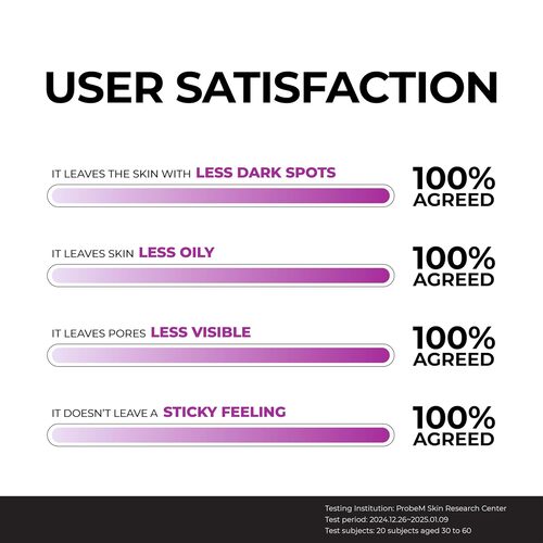 Fórmula dermatológicamente probada que muestra una reducción del -27.7% en la hiperpigmentación y una disminución del -20% en el enrojecimiento después de 2 semanas de uso, dejando la piel más suave y equilibrada.