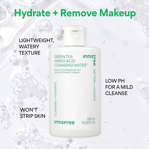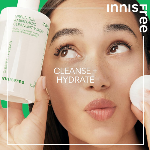 • El Innisfree Green Tea Amino Moisture Cleansing Water está formulado para limpiar la piel suavemente sin causar sequedad ni irritación.